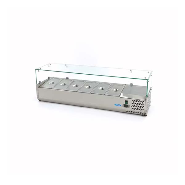 Detta ytmonterade kylränna för bänkskiva har ett glaslock och är 140 cm brett. Den har plats för sex 1/3 GN Gastronorm-behållare där du kan placera ingredienser som du behöver ha till hands och hålla kylda. Den har också en digital temperaturregulator som är enkel att ställa in och avläsa.