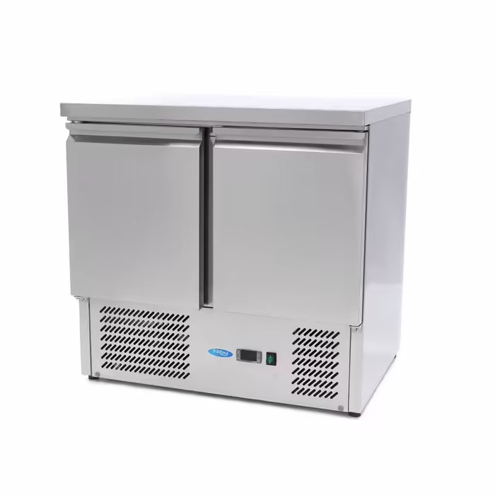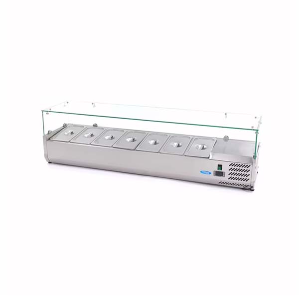 Det här ytmonterade kylränna har ett glaslock och är 120 cm brett. Det har plats för fyra 1/3 GN Gastronorm-behållare där du kan placera ingredienser som du behöver ha till hands och hålla dem svala. Det har också en digital temperaturkontroll som är lätt att ställa in och lätt att läsa av.